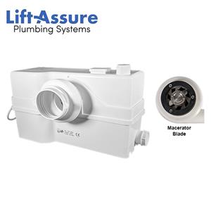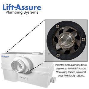 The Lift Assure toilet includes a macerator that gets connected to the back of the toilet. Once the lever flush is triggered water and human waste makes its way to the macerator, where it gets ground into small particles. The waste particles then get pumped upwards and transferred from the basement to the home's main waste line. In addition, the same process applies if the grinder is connected to the sink and/or shower.